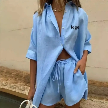 ชุดลำลอง2ชิ้นสำหรับผู้หญิงเสื้อเชิ้ตสีพื้นและกางเกงขาสั้นผ้าลินินผ้าฝ้ายสีเขียว